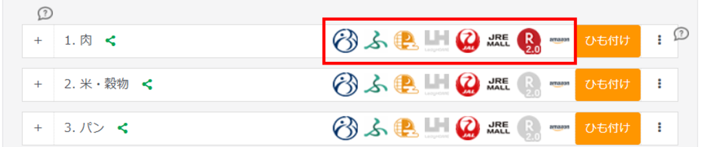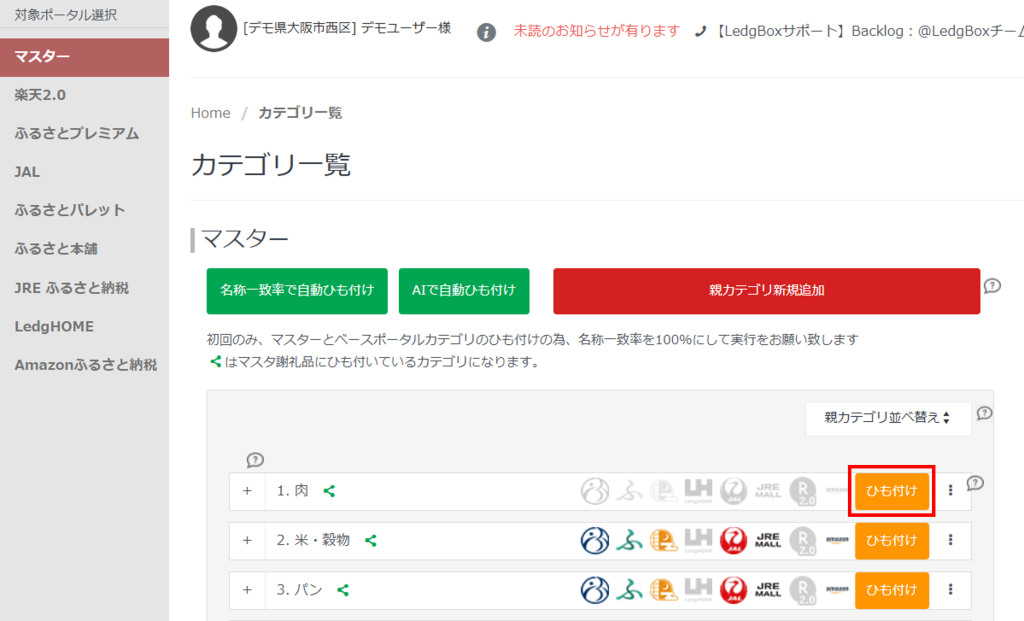 マスターカテゴリの一覧を開き、ひも付け対象のカテゴリの「ひも付け」をクリックします。