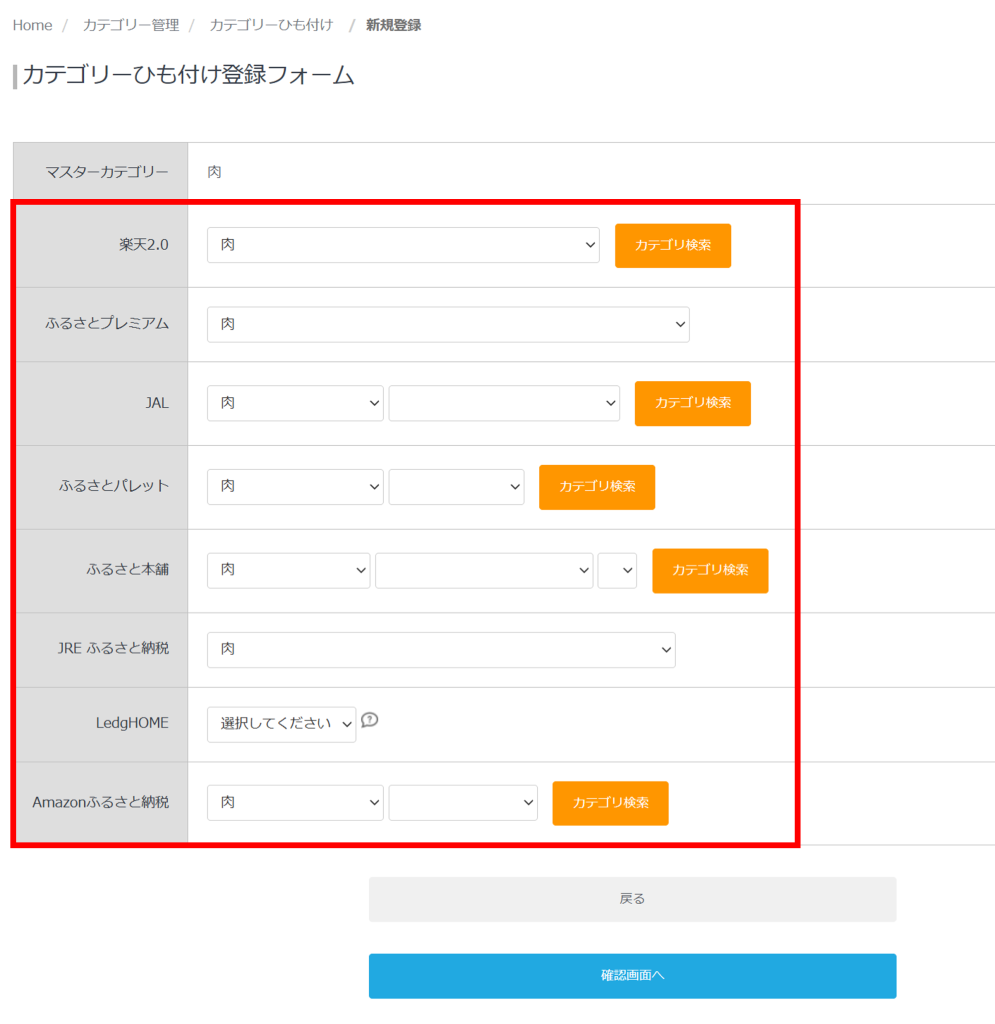 各ポータルサイトごとに、マスターカテゴリにひも付けるカテゴリを選択し、
