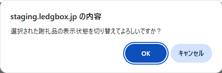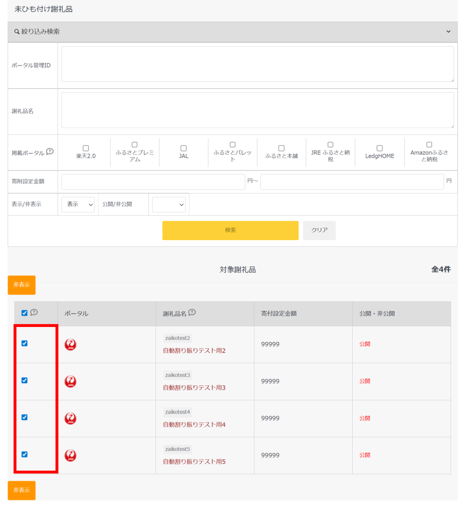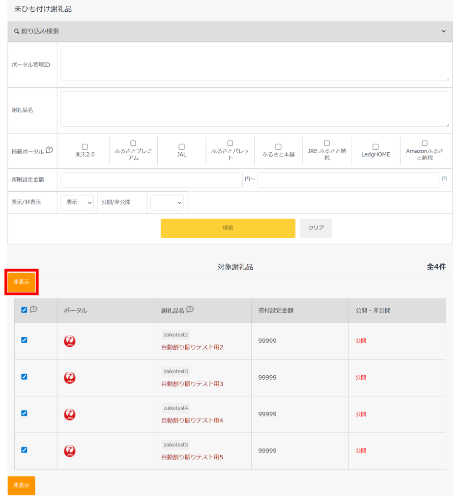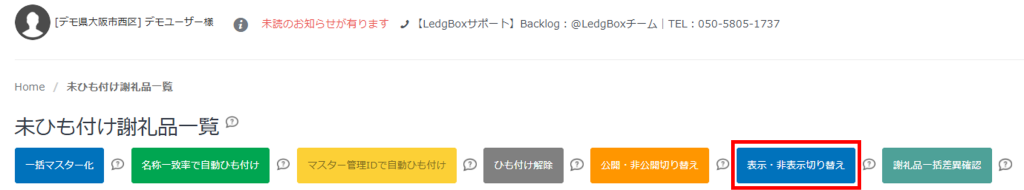 未ひも付けの謝礼品を、未ひも付け一覧画面から一括で表示・非表示に切り替えることができる機能です。
