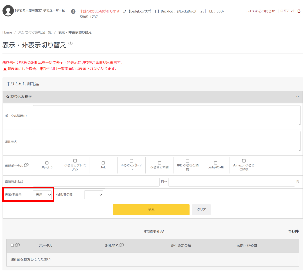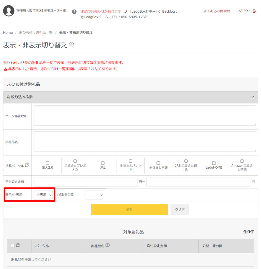 ※非表示の謝礼品を検索する際には、「表示/非表示」を「非表示」に切り替えて検索します。