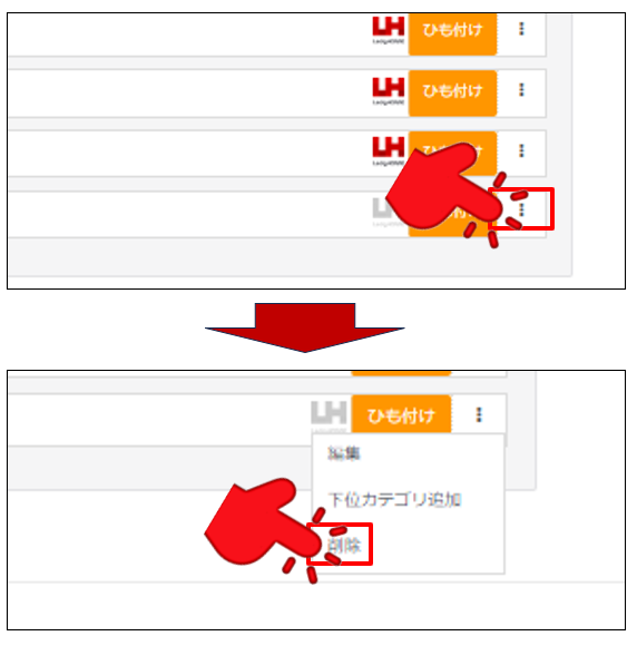 対象のカテゴリ右側にあるメニューボタンを押下いただき、メニューの中から「削除」を押下ください。
