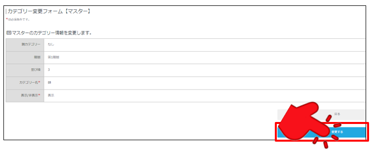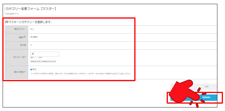 カテゴリー変更フォームが表示されますので、対象の項目の変更を行い「確認画面へ」を押下ください。