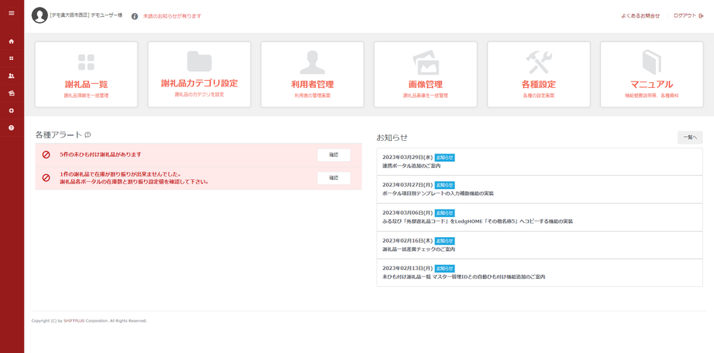 ダッシュボードでは各種アラートやお知らせを確認できます。