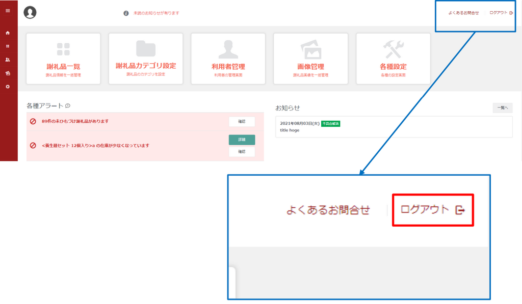 各画面の右上にある「ログアウト」を実行し、ログアウトを行ってください。