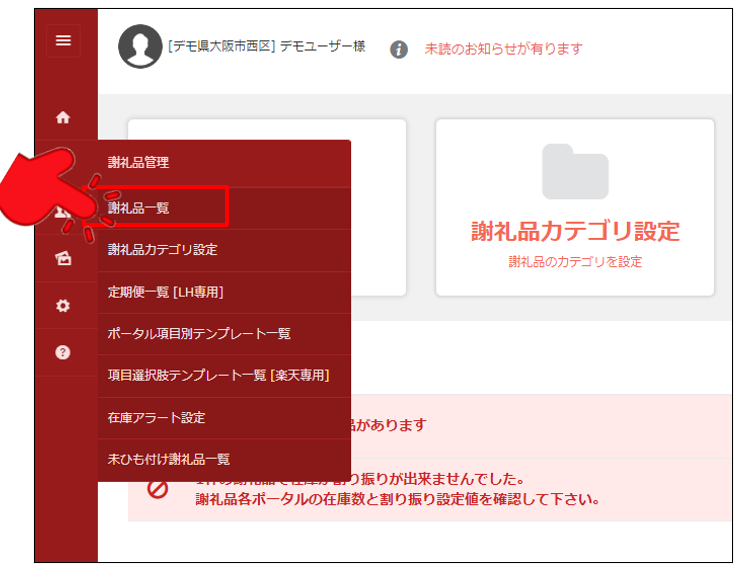 左側にあるメニューバーの謝礼品管理より「謝礼品一覧」を押下ください。