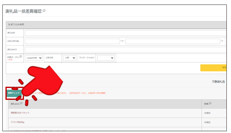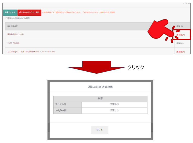 一括差異チェックの結果が表示されますので、「差異あり」をクリックいただくと差異の内容が表示されます。