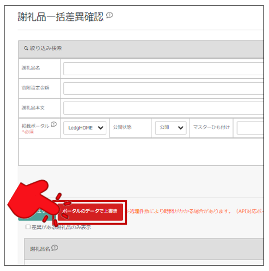 差異チェックの結果に問題がなく、ポータルサイト側の情報で上書きする場合は「ポータルのデータで上書き」のボタンを押下ください。