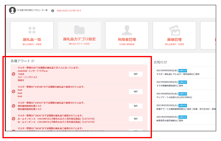 対象謝礼品の総在庫数がマスターで設定している「合計在庫数アラート閾値」を下回った際に起こるアラートです。