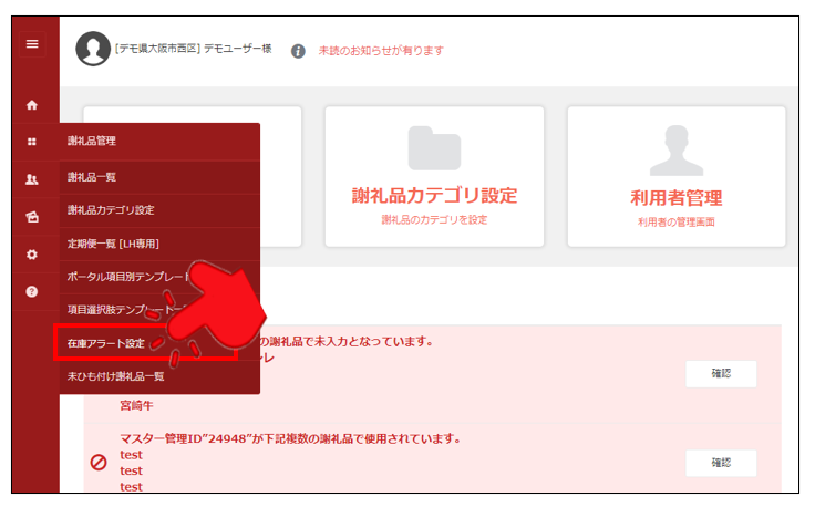 左側メニューの謝礼品管理の中にある「在庫アラート設定」を押下ください。