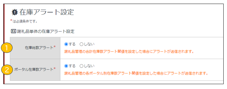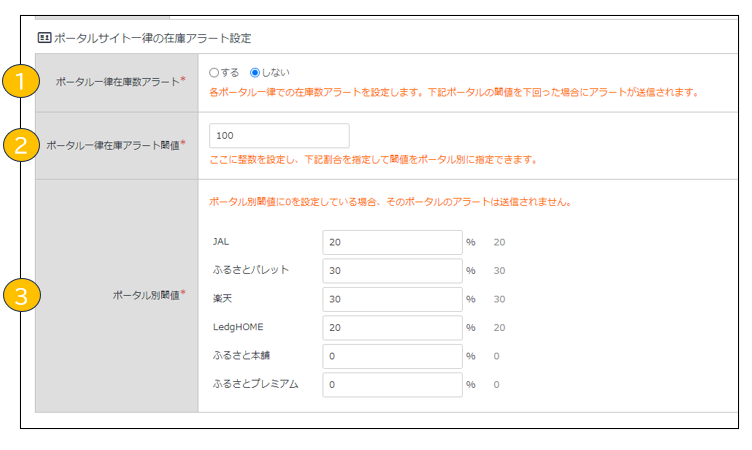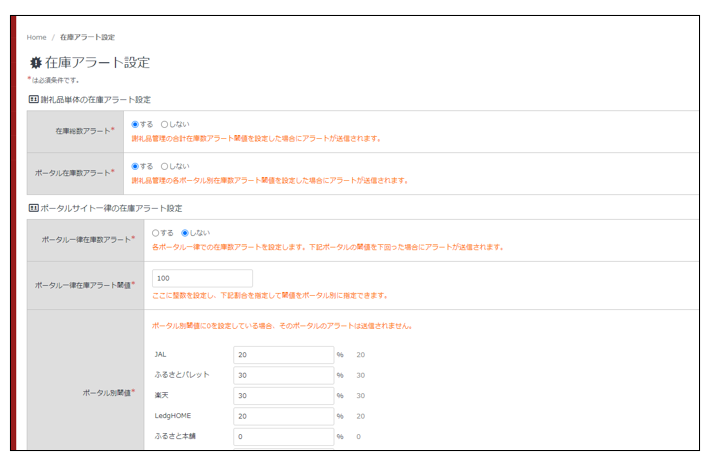 全謝礼品に共通のポータル別在庫数のアラート設定を行うか設定する項目です。