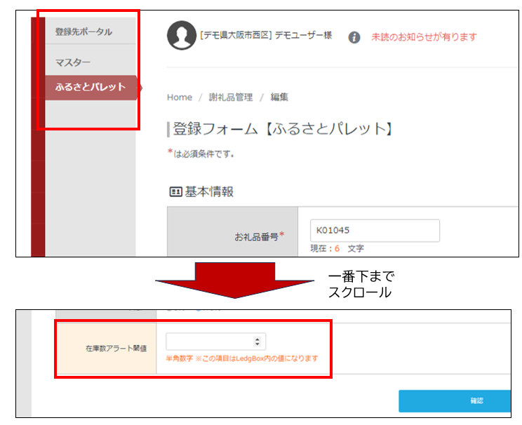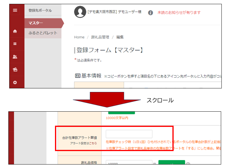 マスター謝礼品の基本情報内に「合計在庫数アラート閾値」の項目があるためこちらでご設定ください。