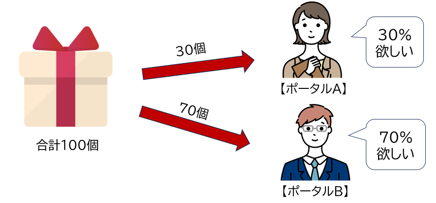 連携時に在庫が切れているポータルサイトがあった際に総在庫数を元に設定した割合で在庫を振り分けられます。