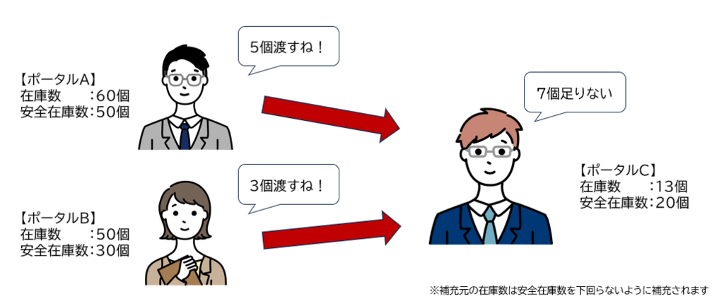 補充する際は補充元で設定している安全在庫数の1割ずつで補充され、連携されるポータルの順番に補充を行われます。