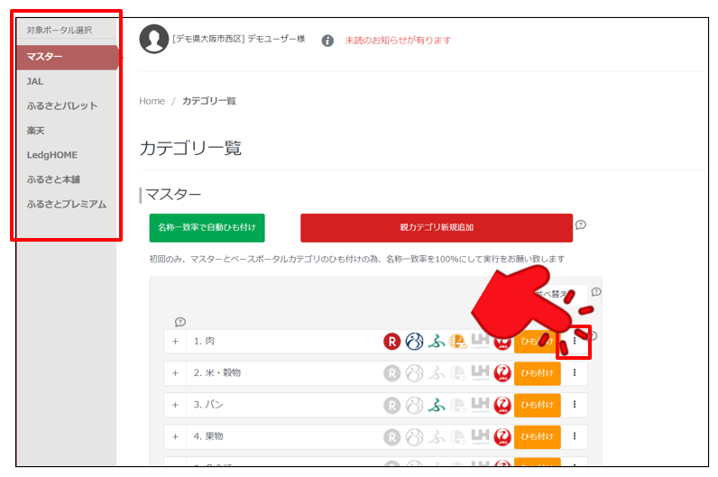 「対象ポータル選択」の中からマスター、楽天、LedgHOMEの中で子カテゴリを追加したいポータルを選択いただき、