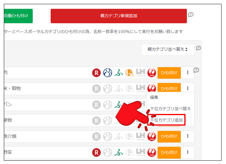 メニュー内にあります「下位カテゴリ追加」を押下ください。