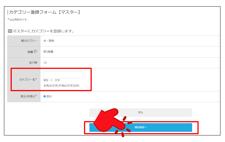 カテゴリ登録フォームが表示されるため「カテゴリ名」を入力いただき、「確認画面へ」を押下ください。