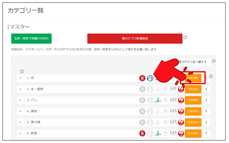 マスター内の対象カテゴリの右側にある「ひも付け」のボタンをクリックする。