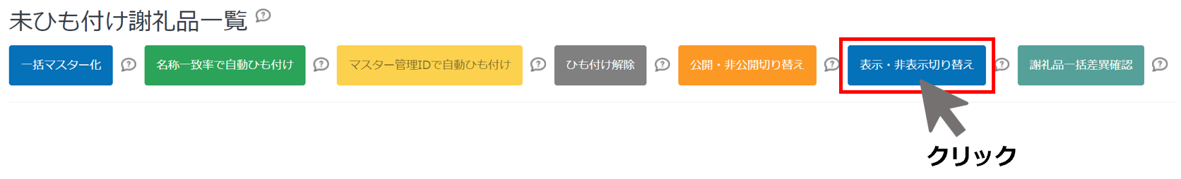 表示・非表示切り替えとは、複数の未ひも付け謝礼品を一括で、表示・非表示に切り替える事ができる機能です。