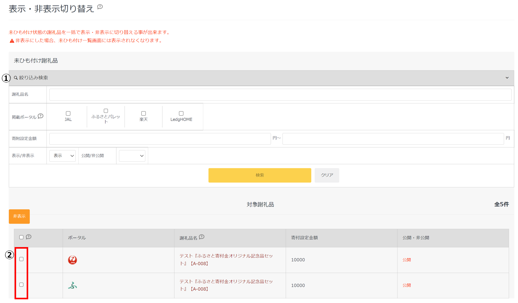 ①謝礼品名・掲載ポータル・寄附設定金額・表示/非表示・公開/非公開 から表示/非表示の切り替えを行いたい謝礼品を検索することができます。