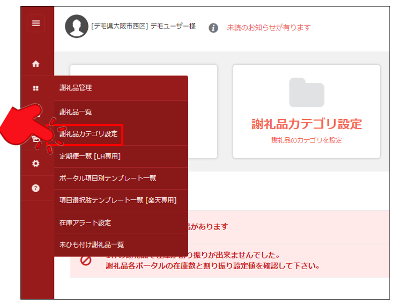 左側にあるメニューバーの謝礼品管理より「謝礼品カテゴリ設定」を押下いただくことで設定画面を開くことができます。