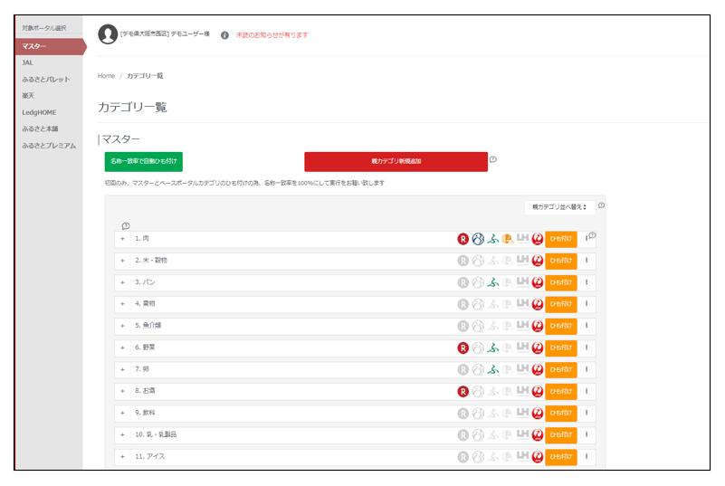 謝礼品カテゴリ設定とは、各ポータルで設定するカテゴリがマスターのどのカテゴリと同じであるか設定する項目となります。