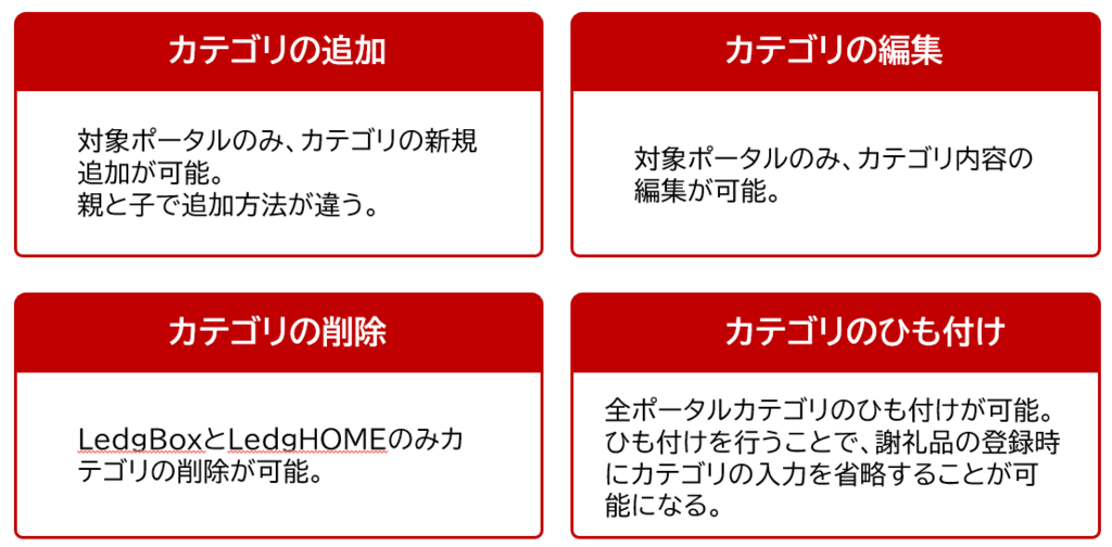 謝礼品のカテゴリ設定には4つの機能がございます。