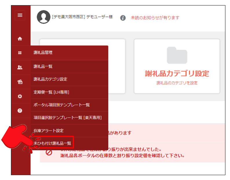 左側にあるメニューバーの謝礼品管理より「未ひも付け謝礼品一覧」をクリックする。