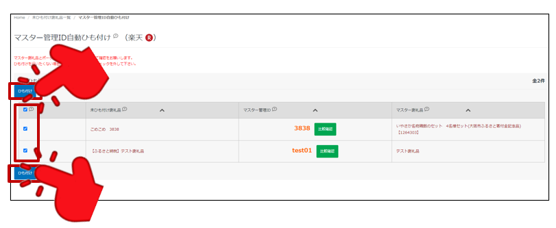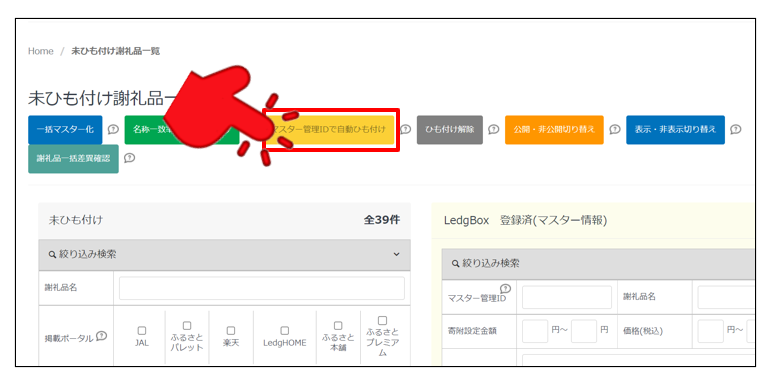 画面上部にある「マスター管理IDで自動ひも付け」ボタンをクリックする