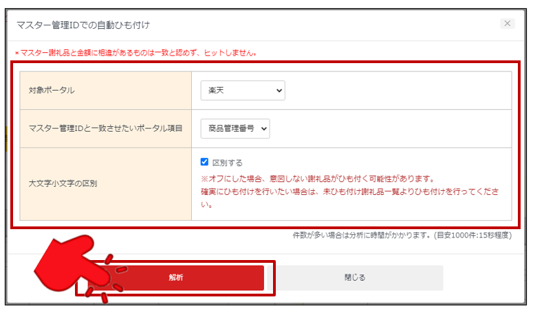 注意書きに記載されている通り、重複登録がある場合には意図しないひも付けが起きる可能性があるため、不安な場合には名称一致によるひも付けを行う。