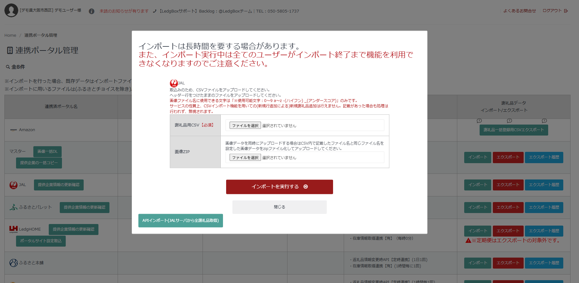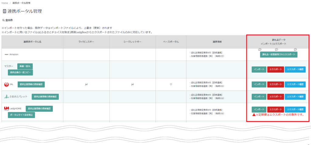 LedgBoxに連携しているポータルサイトの謝礼品情報や画像データを一括更新することができます。