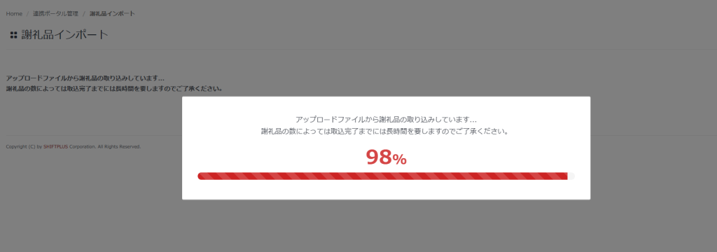 「インポート」機能では、LedgBoxから出力したCSVデータや画像のZIPファイルを取込むことができます。データを取込むと謝礼品情報が上書きされます。謝礼品情報を更新する際にご活用ください。