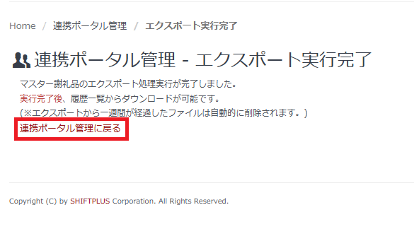 ③「エクスポート実行完了」画面が表示されますので、「連携ポータル管理に戻る」をクリックします。